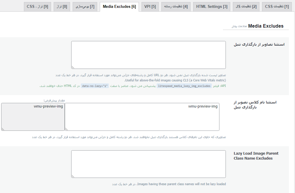 این گزینه برای مستثنی کردن تصاویر استفاده میشود به طور مثال پیشنهاد می شود تصاویر بالای صفحه را از لود تنبل مستثنی کنید (لوگو، تصاویر نوار کناری، تصاویر پس زمینه و غیره). همچنین میتوانید تصاویر را براساس URL، نام کلاس، URI مستثنی کنید