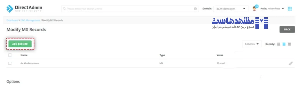 3) برای ایجاد MX رکورد در دایرکت ادمین بر روی گزینه Add Record کلیک کنید.