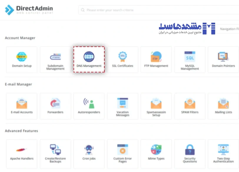 2) در بخش Account Manager بر روی گزینه DNS Management کلیک کنید.