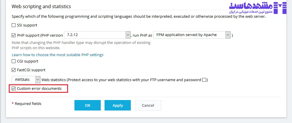 3) تیک گزینه Custom error documents را فعال کنید و سپس دکمه OK را انتخاب کنید.