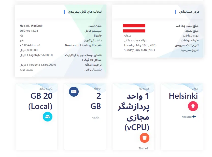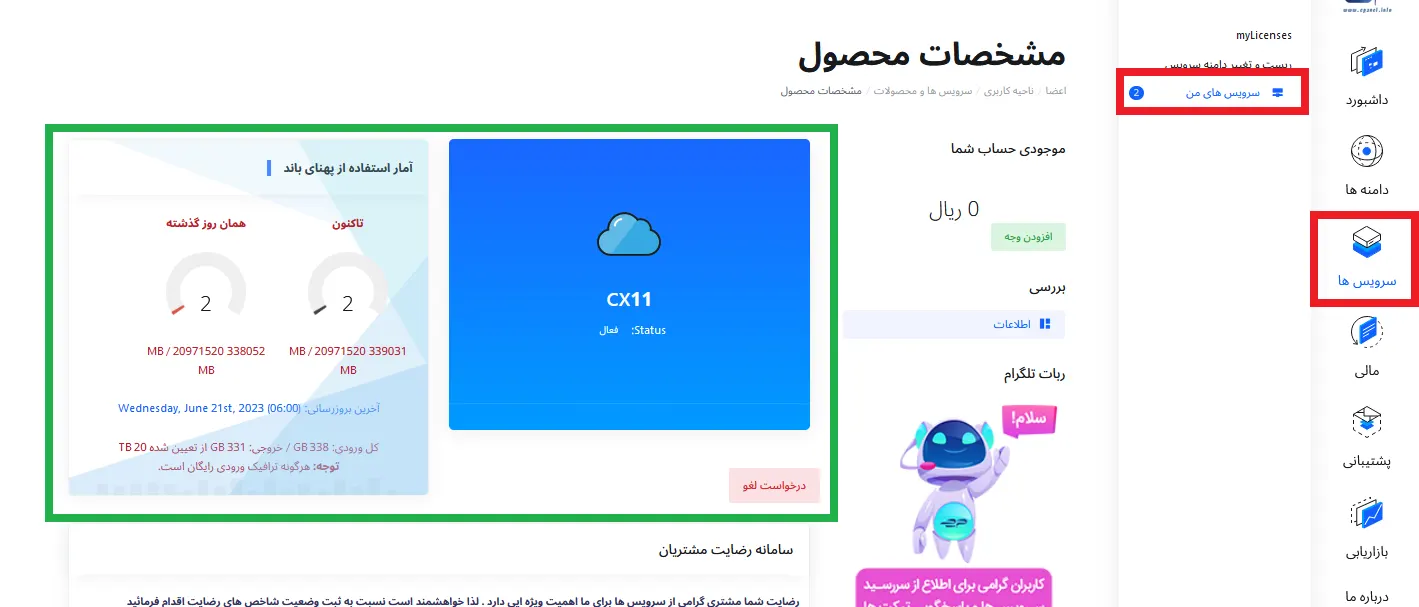 2) از منوی سرویس ها / سرویس های من را انتخاب کنید. سپس در لیست سرویس های فعال، بر روی سرور ابری مدنظر خود که قصد دارید حالت نجات را بر روی آن فعال کنید کلیک کنید تا صفحه مشخصات محصول مطابق تصویر زیر برای شما باز شود.