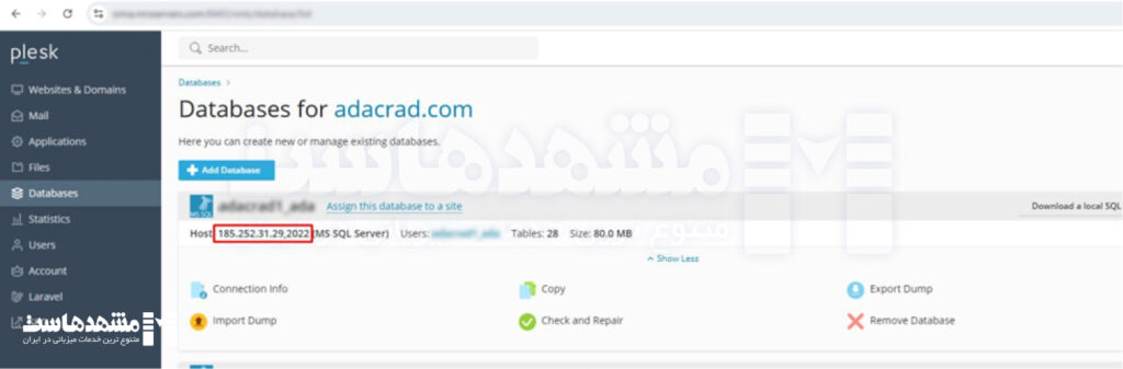 آدرس اتصال به SQL Server بهصورت IP,Port نمایش داده میشود. برای دسترسی به این اطلاعات، کافی است وارد کنترل پنل هاست خود شوید و در بخش Databases آدرس و پورت اتصال را مشاهده کنید.