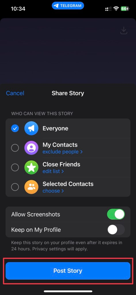• تنظیمات استوری را می توانید تغییر دهید و در نهایت روی دکمه Post Story بزنید.