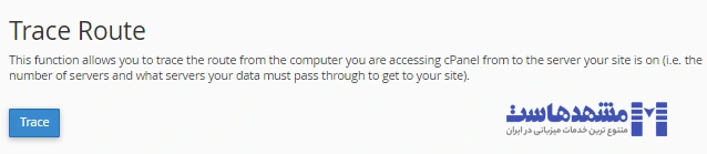 • Trace Route : با این سرویس می توانید مسیری که از سرور سایت خودتان به سمت رایانه ای که از آن به سی پنل دسترسی دارید را ردیابی کنید (یعنی تعداد سرورهایی که داده ها باید از آن عبور کنند تا به سایت شما برسند). این قابلیت برای تشخیص مشکلات اتصال شبکه به سرور بسیار کاربردی است.