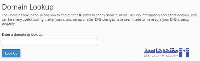 • Domain Lookup : با استفاده از این سرویس می توانید DNS دامنه را مشاهده کنید و مطمئن شوید پس از انجام تغییراتی که داده اید، DNS ها به درستی تنظیم شده است.