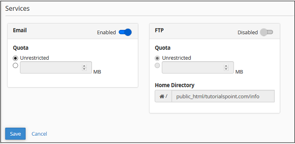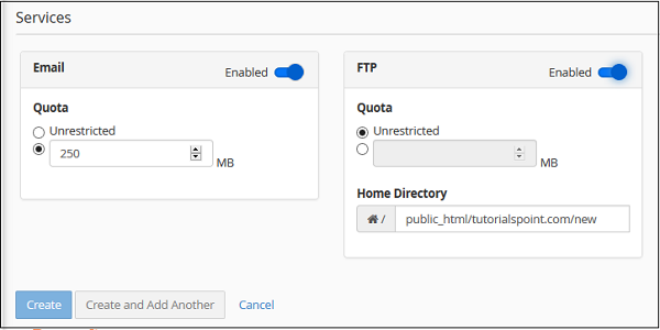5) در بخش Services، با تغییر وضعیت دکمه سوئیچ می توانید دسترسی های کاربر جدید به سرویس های مختلف نظیر : ایمیل، اکانت FTP و یا فضای دیسک را فعال یا غیرفعال کنید.