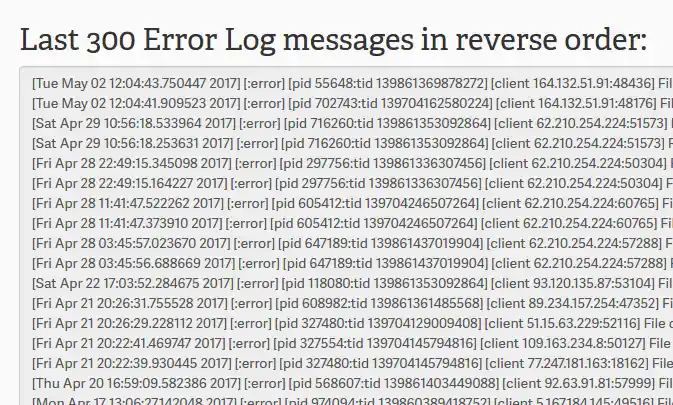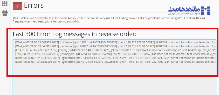 اینجا لیستی از خطاهای رخ داده به شما نمایش داده می شود. شما می توانید به صورت دوره ای از همین بخش گزارش خطاها را بررسی کنید تا ببینید آیا وب سایت شما با خطای خاصی مواجه شده است یا نه تا در اسرع وقت نسبت به رفع آن اقدام نمایید.