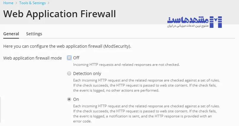 3) حال در صفحه باز شده، می توانید برای روشن کردن فایروال یکی از وضعیت های On یا Detection Only را انتخاب کنید. فایروال ModSecurity تمام درخواست هایی که به سرور شما ارسال می شود و پاسخ هایی که از سرور دریافت می کند را بر اساس قوانینی (Ruls) که برای آن تعیین شده بررسی می کند. در صورتی که این بررسی ها موفقیت آمیز باشند، درخواست HTTP به وب سایت ارسال می شود. در غیر این صورت یعنی اگر بررسی ها با شکست مواجه شود، مجموعه اقداماتی که از قبل برایش تعریف شده انجام می شود.