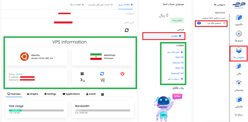 2) از منوی سرویس ها / سرویس های من / بر روی نام سرویس مورد نظر خود کلیک کنید تا صفحه مربوط به تنظیمات و دکمه های عملیاتی سرور به شما نمایش داده شود.